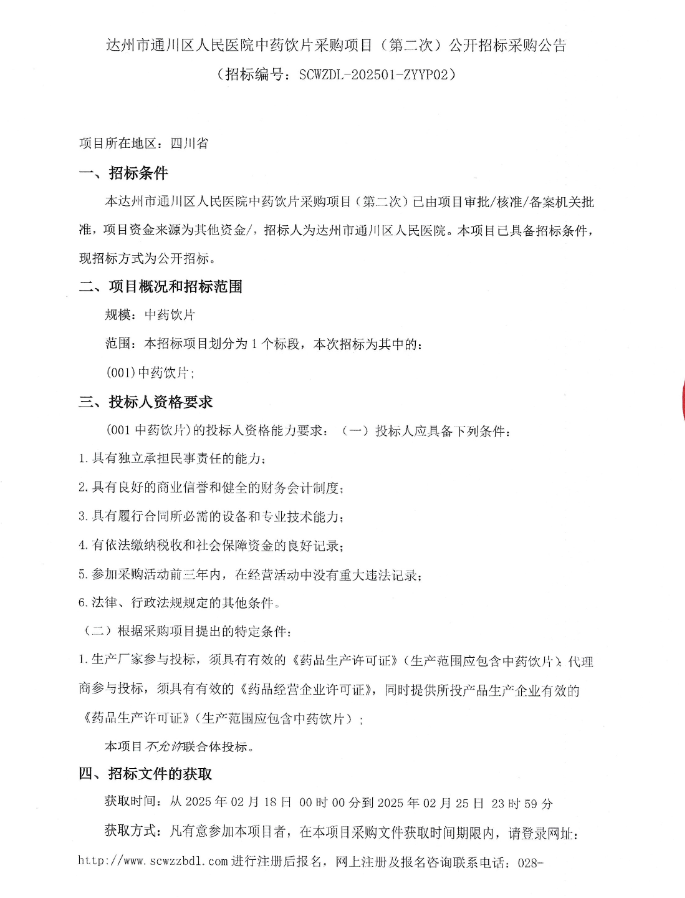 【达州市通川区人民医院】四川省达州市通川区人民医院中药饮片采购项目(第二次)公开招标采购公告