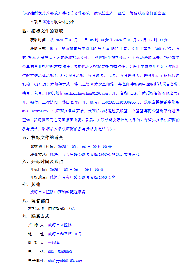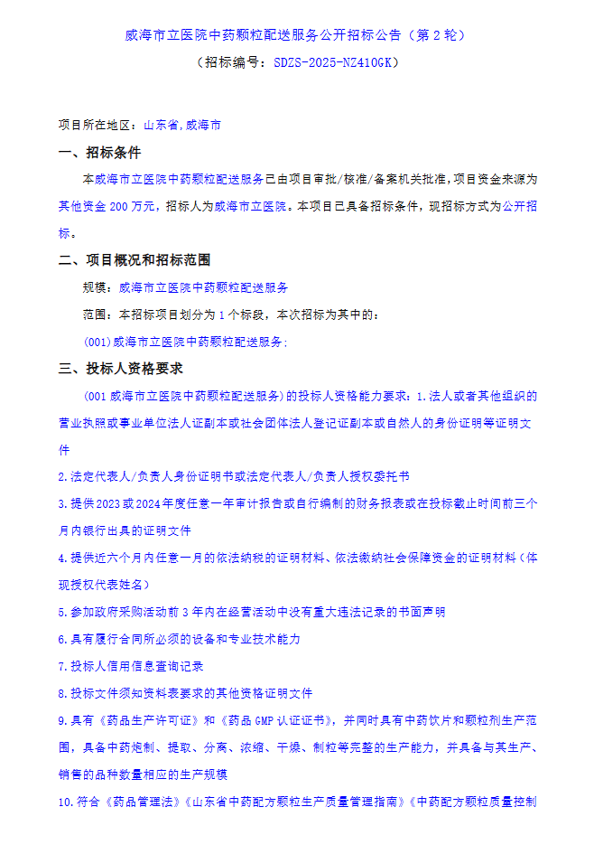 【威海市立医院】山东省威海市立医院中药颗粒配送服务公开招标公告(第2轮)