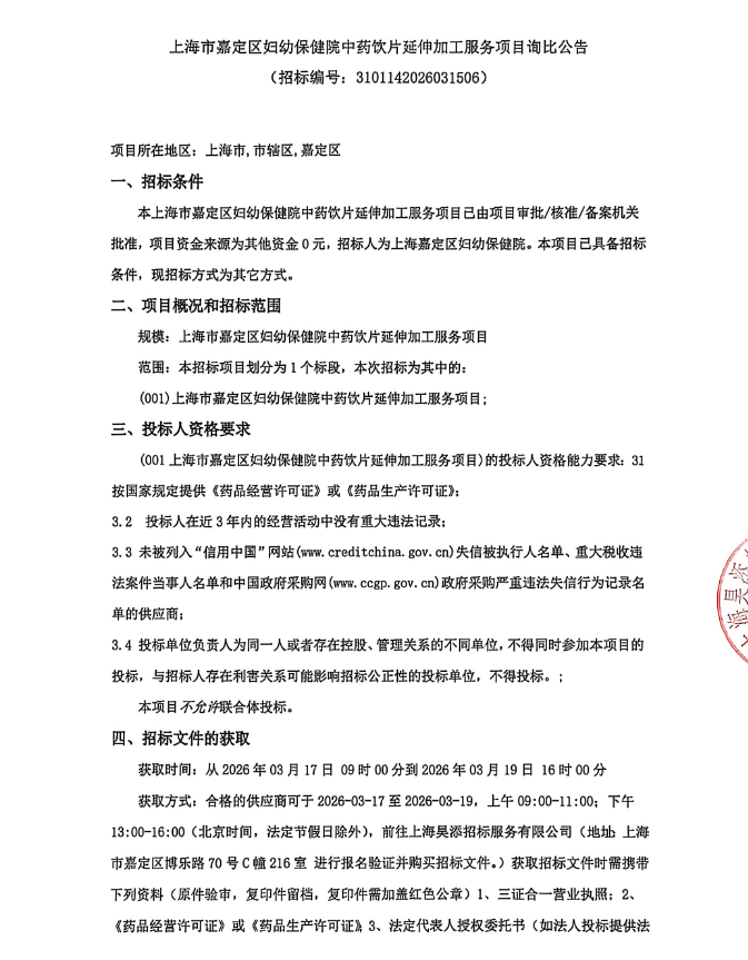【上海市嘉定区妇幼保健院】上海市嘉定区妇幼保健院中药饮片延伸加工服务项目询比公告