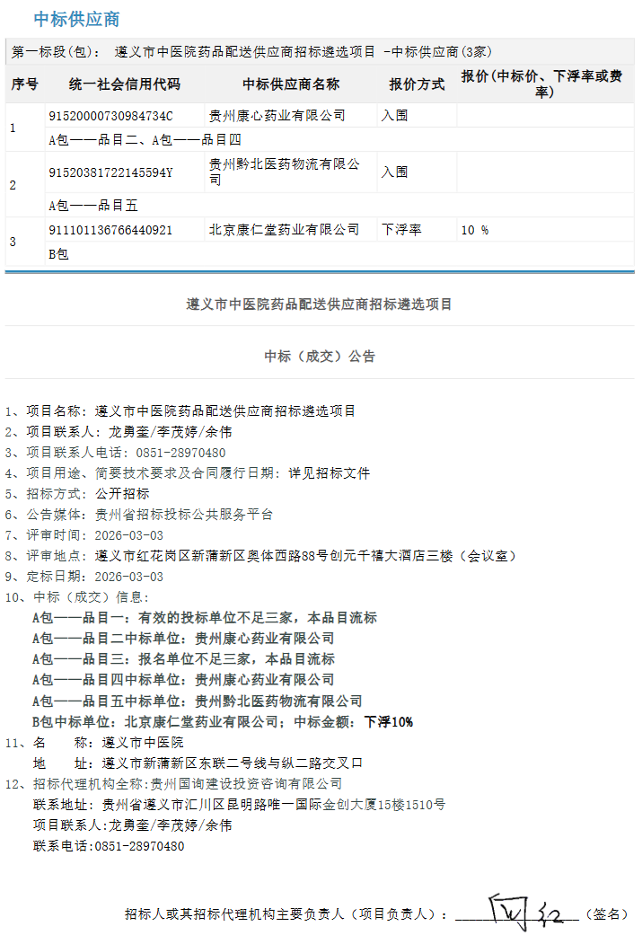 【遵义市中医院】贵州省遵义市中医院药品配送供应商招标遴选项目中标(成交)公告