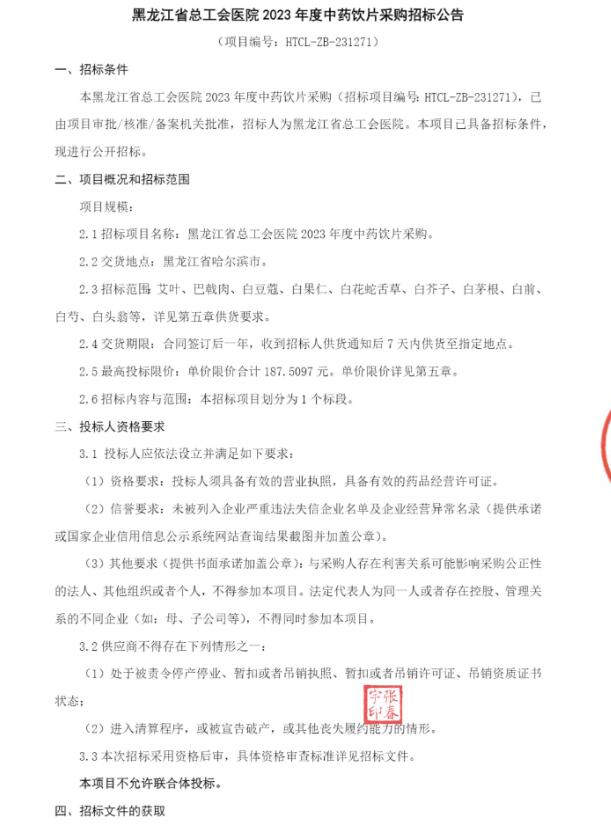 【黑龙江省总工会医院】黑龙江省总工会医院2023年度中药饮片采购-公开招标公告