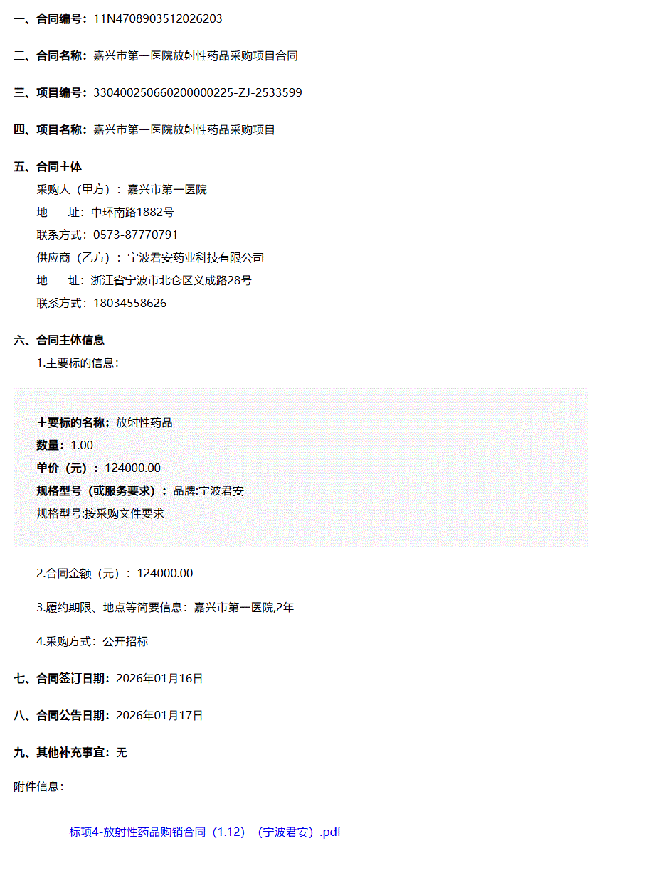 【嘉兴市第一医院】浙江省嘉兴市第一医院放射性药品采购项目合同公告3