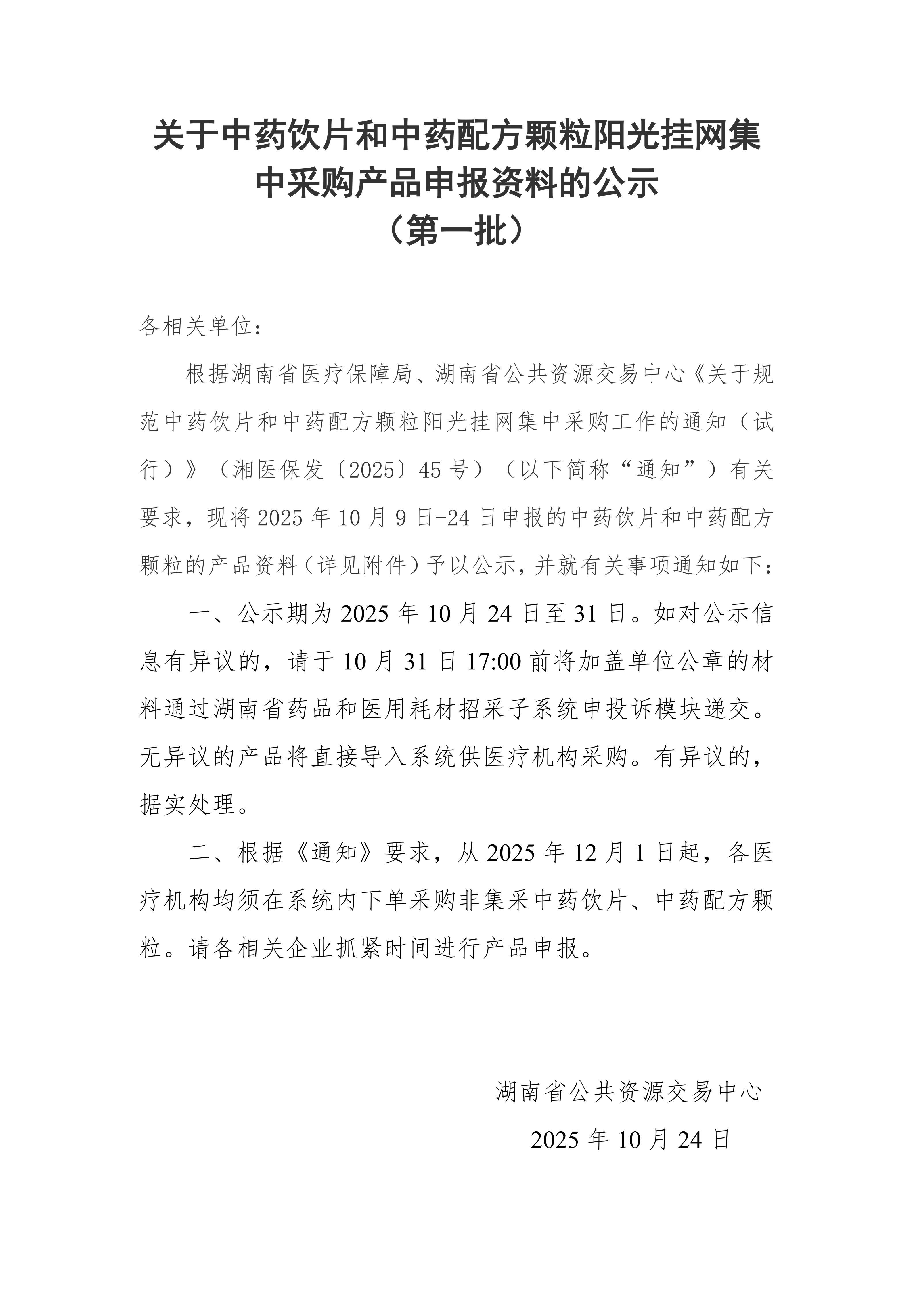 各相关单位: 根据湖南省医疗保障局、湖南省公共资源交易中心《关于规范中药饮片和中药配方颗粒阳光挂网集中采购工作的通知(试行)》(湘医保发〔2025〕45号)(以下简称“通知”)有关要求,现将2025年10月9日-24日申报的中药饮片和中药配方颗粒的产品资料(详见附件)予以公示,并就有关事项通知如下: 一、公示期为2025年10月24日至31日。如对公示信息有异议的,请于10月31日17:00前将加盖单位公章的材料通过湖南省药品和医用耗材招采子系统申投诉模块递交。无异议的产品将直接导入系统供医疗机构采购。有异议的,据实处理。 二、根据《通知》要求,从2025年12月1日起,各医疗机构均须在系统内下单采购非集采中药饮片、中药配方颗粒。请各相关企业抓紧时间进行产品申报。