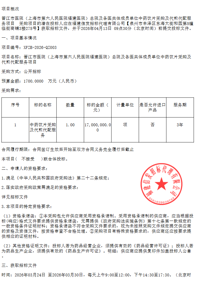 【泉州市晋江市医院】福建省晋江市医院(上海市第六人民医院福建医院)总院及各医共体成员单位中药饮片采购及代煎代配服务项目招标公告