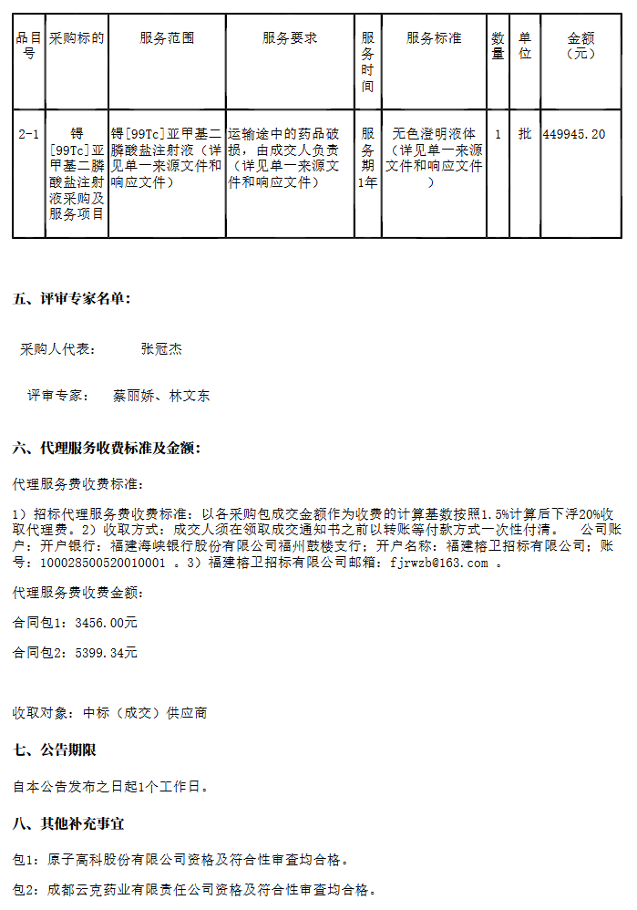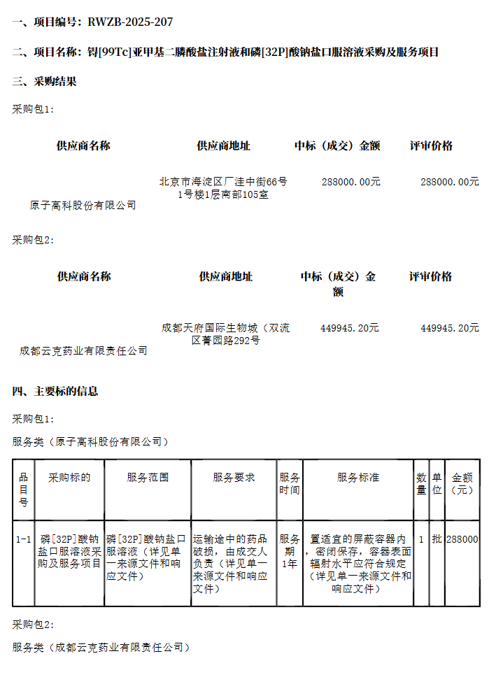 【福建医科大学附属第二医院】福建医科大学附属第二医院锝〔99Tc〕亚甲基二膦酸盐注射液和磷〔32P〕酸钠盐口服溶液采购及服务项目结果公告