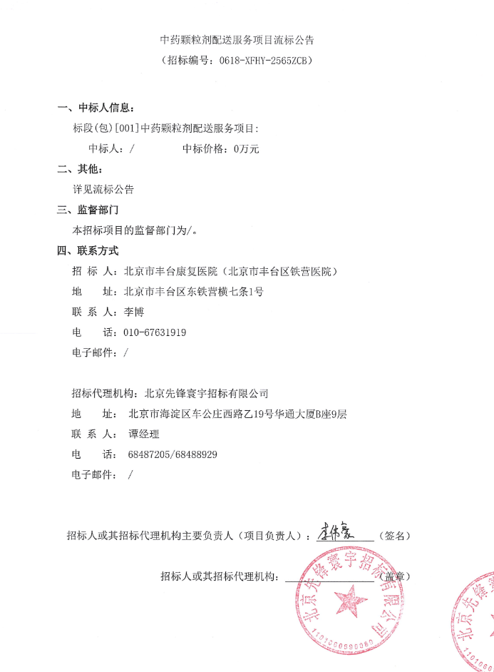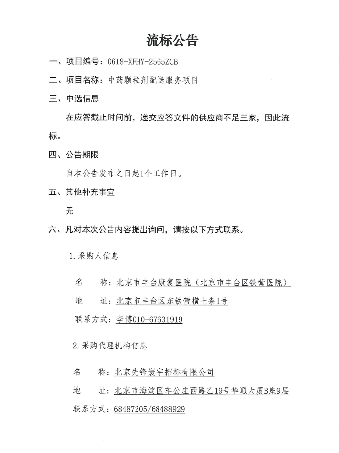 【北京市丰台康复医院】北京市丰台康复医院(铁营医院)中药颗粒剂配送服务项目流标公告