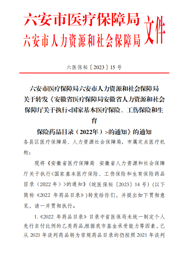 现将《安徽省医疗保障局 安徽省人力资源和社会保障厅关于执行<国家基本医疗保险、工伤保险和生育保险药品目录(2022年)>的通知》(皖医保秘〔2023〕14号)(以下简称《2022年药品目录》)转发给你们,并提出如下贯彻意见,请一并贯彻执行。