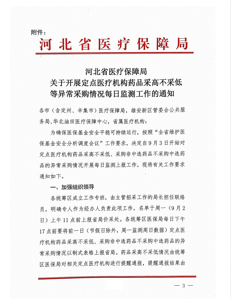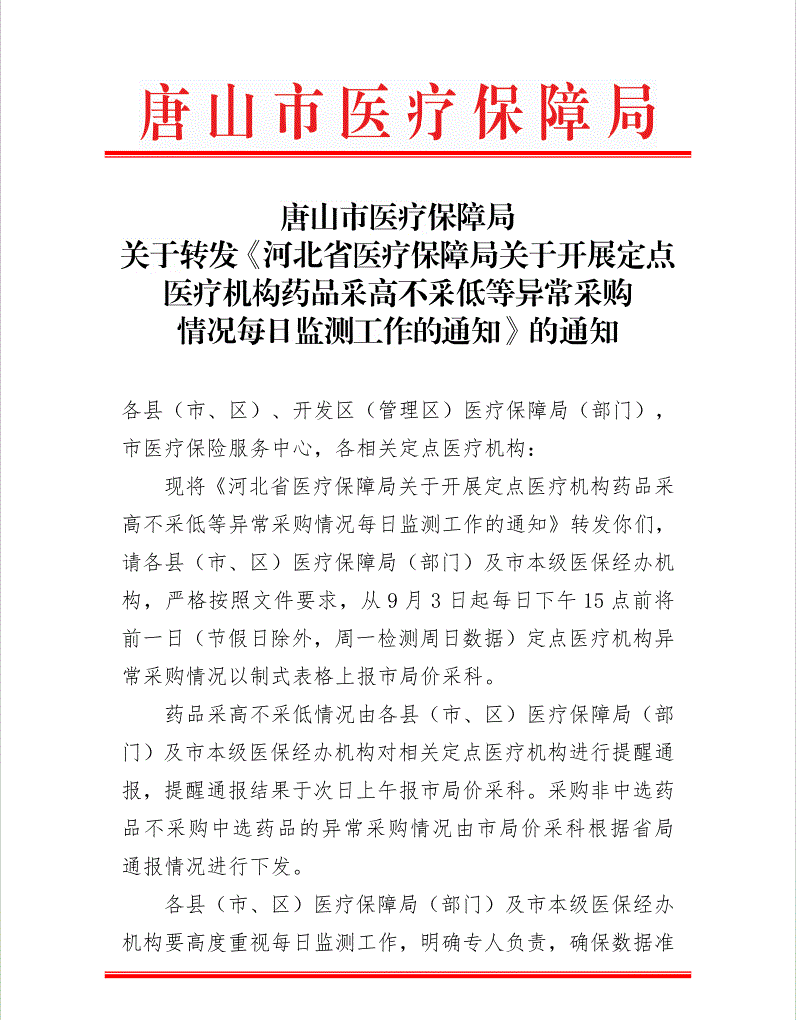 【唐山】唐山市医疗保障局关于转发《河北省医疗保障局关于开展定点医疗机构药品采高不采低等异常采购情况每日监测工作的通知》