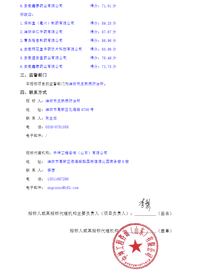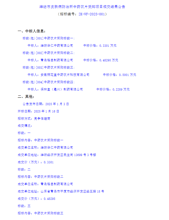 【潍坊市皮肤病防治所】山东省潍坊市皮肤病防治所中药饮片采购项目成交结果公告
