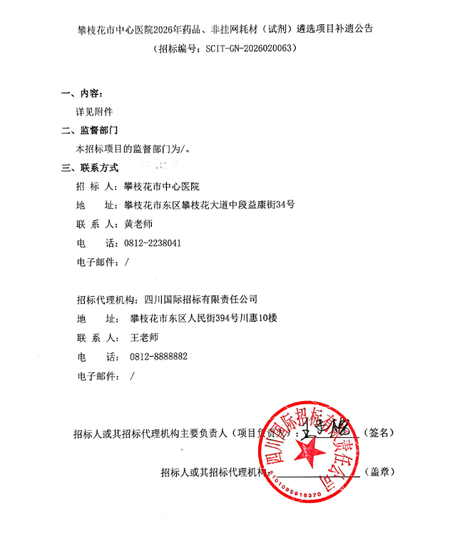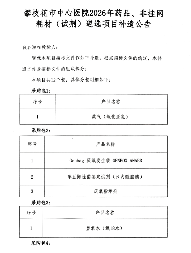 【攀枝花市中心医院】四川省攀枝花市中心医院2026年药品、非挂网耗材(试剂)遴选项目补遗公告