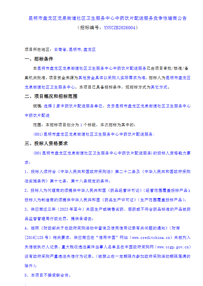 【昆明市盘龙区龙泉街道社区卫生服务中心】云南省昆明市盘龙区龙泉街道社区卫生服务中心中药饮片配送服务竞争性磋商公告