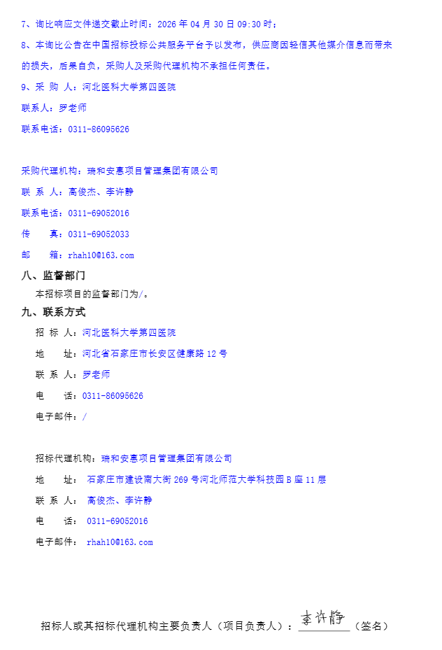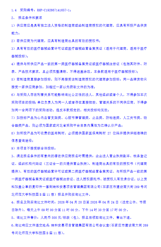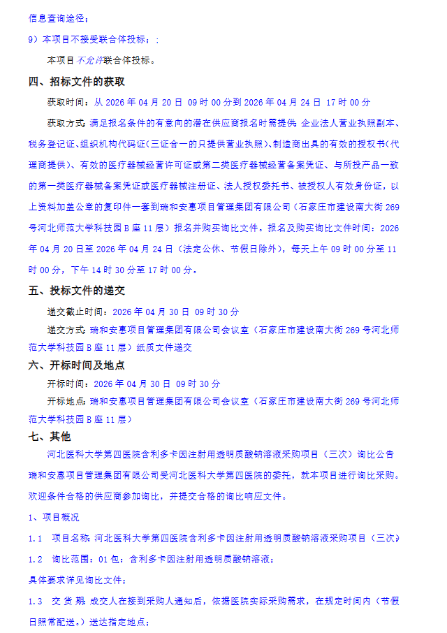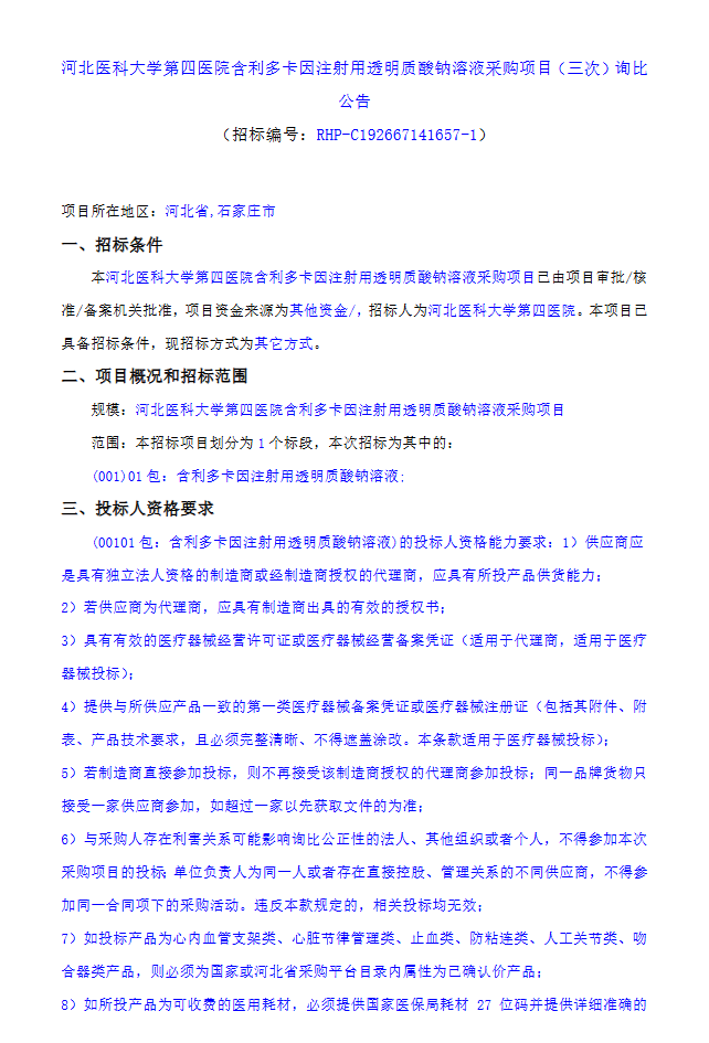 【河北医科大学第四医院】河北医科大学第四医院含利多卡因注射用透明质酸钠溶液采购项目(三次)询比公告