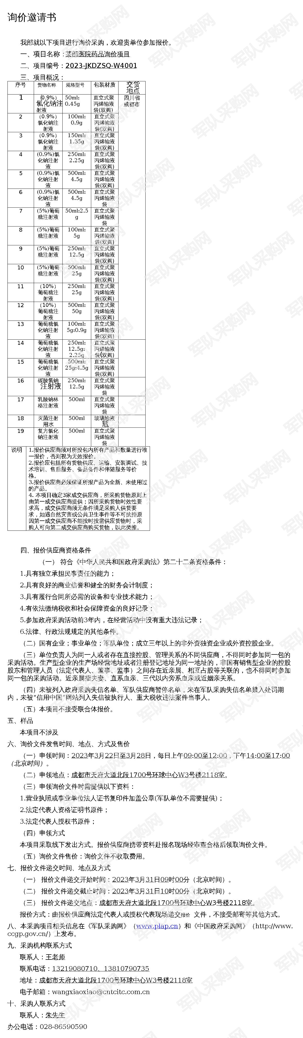 【军队采购】军队采购网某部医院药品询价项目公告2023-JKDZSQ-W4001