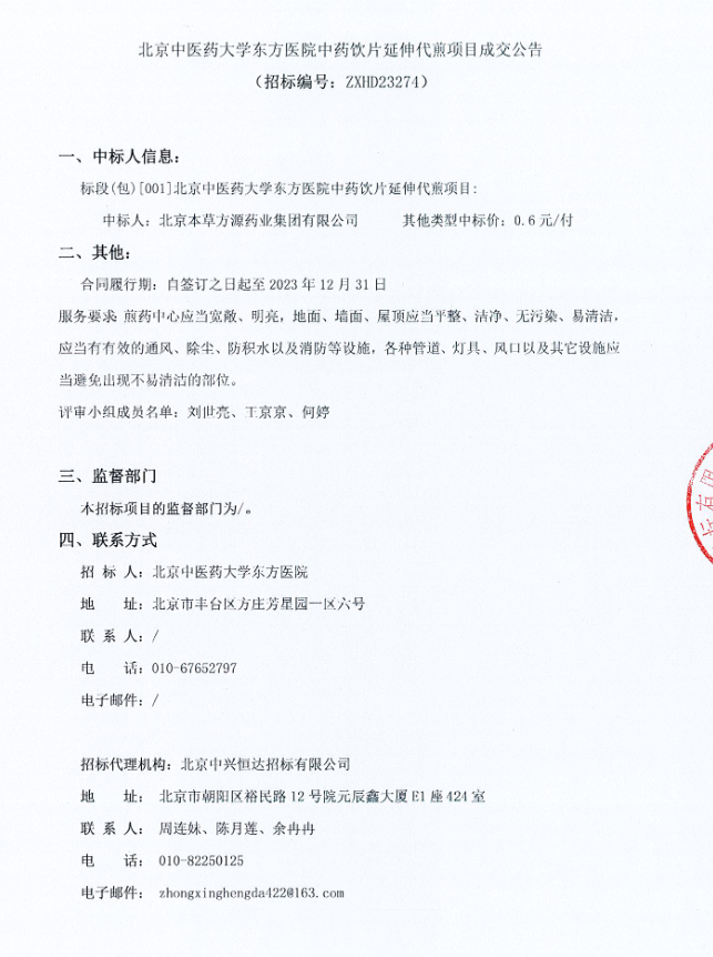 【北京中医药大学东方医院】北京中医药大学东方医院中药饮片延伸代煎项目成交公告