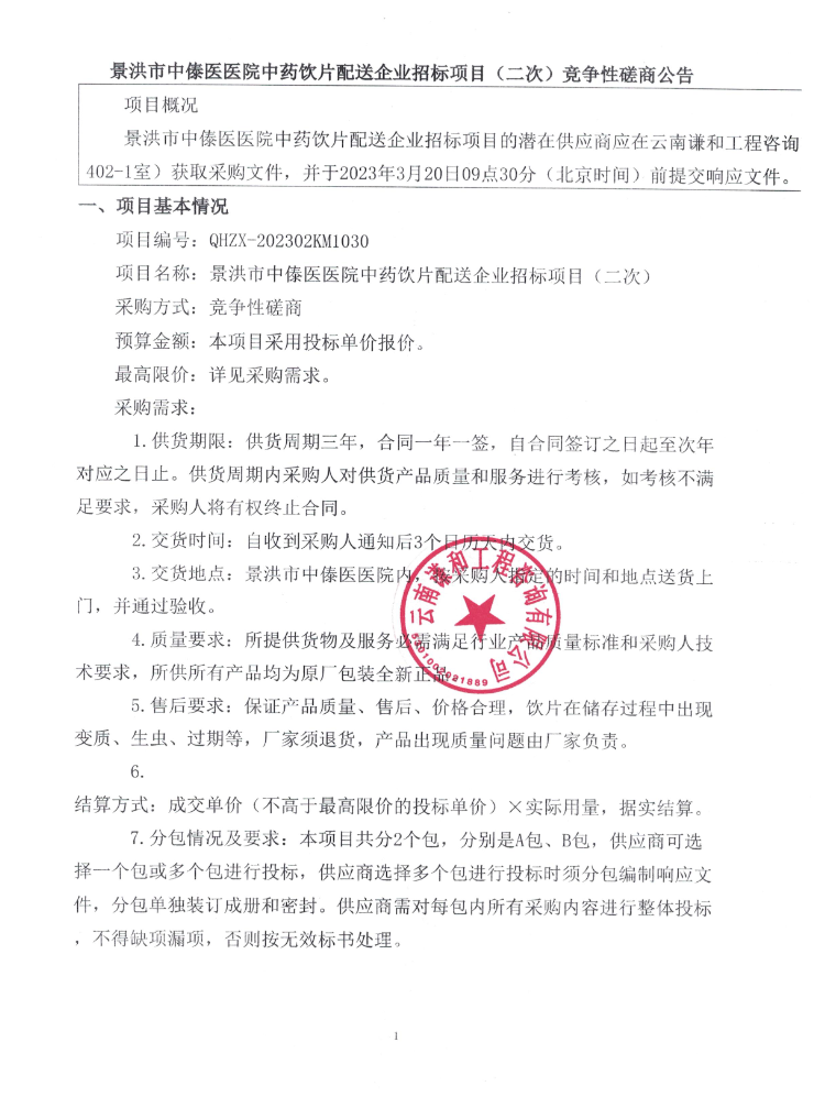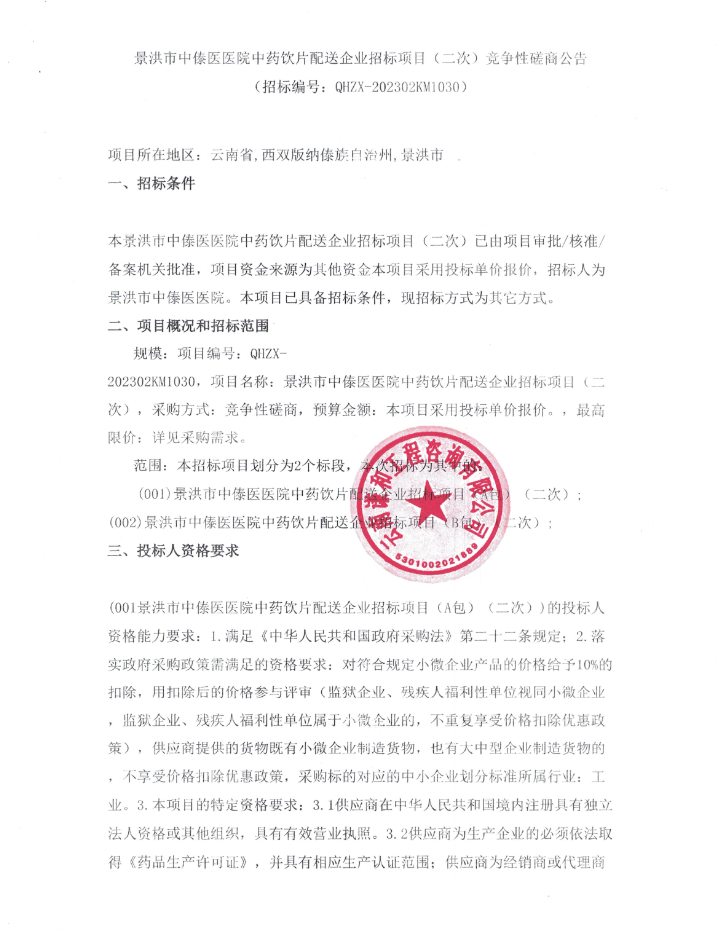 【景洪市中傣医医院】云南省西双版纳傣族自治州景洪市中傣医医院中药饮片配送企业招标项目(二次)竞争性磋商公告