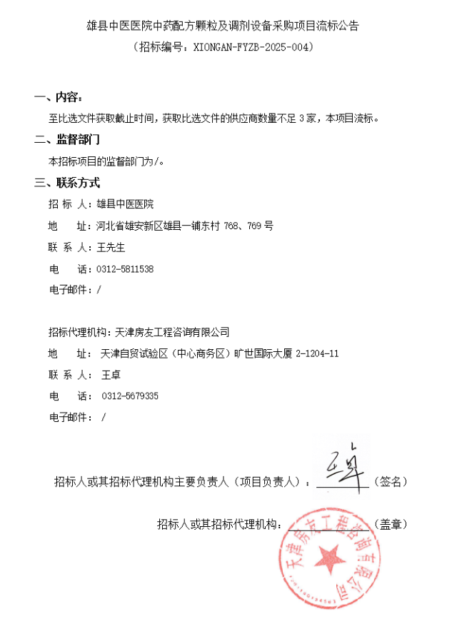 【保定市雄县中医医院】河北省保定市雄县中医医院中药配方颗粒及调剂设备采购项目流标公告