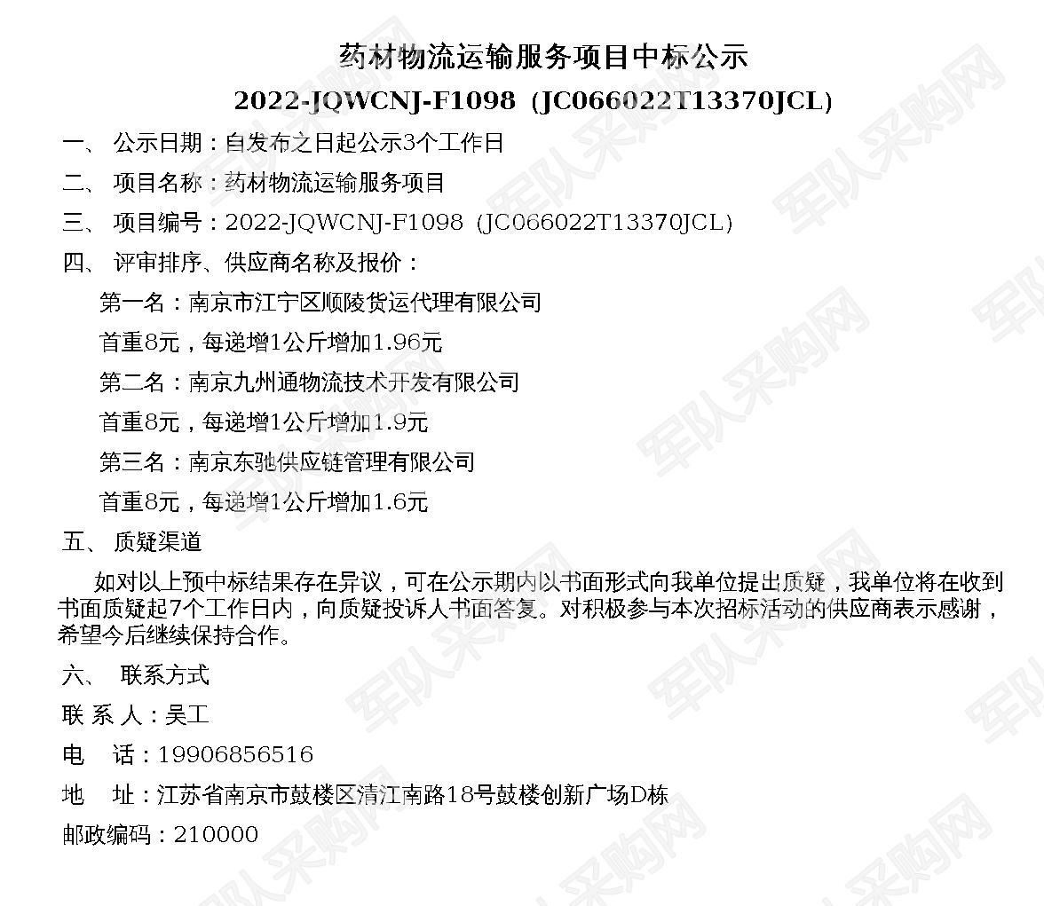 【军队采购】军队采购网药材物流运输服务项目中标公示2022-JQWCNJ-F1098