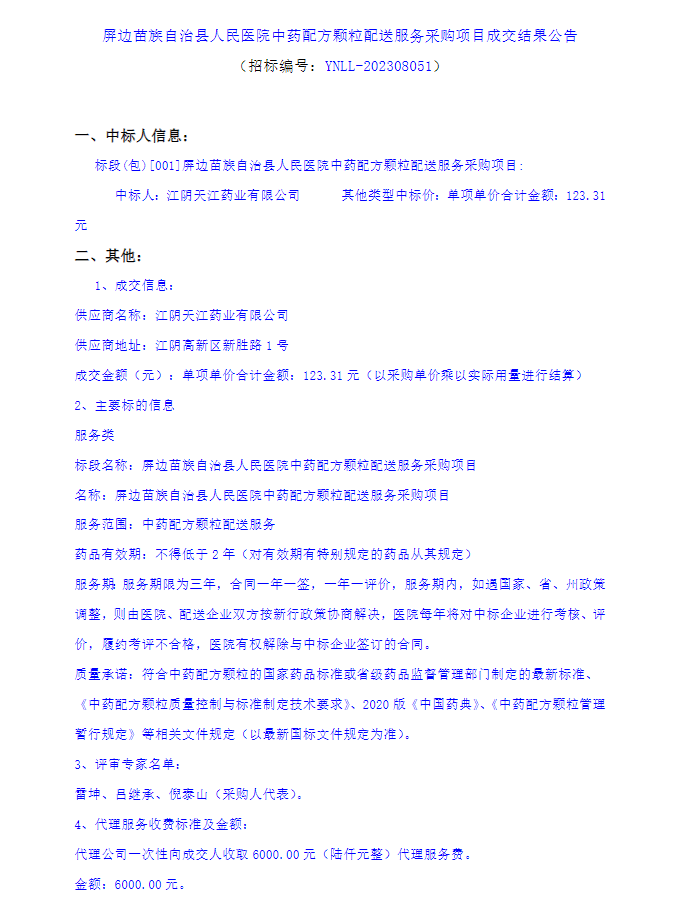 【红河哈尼族彝族自治州屏边苗族自治县人民医院】云南省红河哈尼族彝族自治州屏边苗族自治县人民医院中药配方颗粒配送服务采购项目成交结果公告