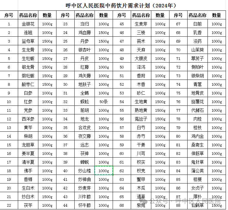 后附:呼中区人民医院中药饮片需求计划(2024年)