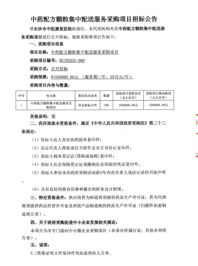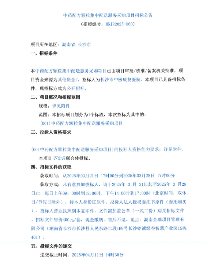 【长沙市中医康复医院】湖南省长沙市中医康复医院中药配方颗粒集中配送服务采购项目招标公告