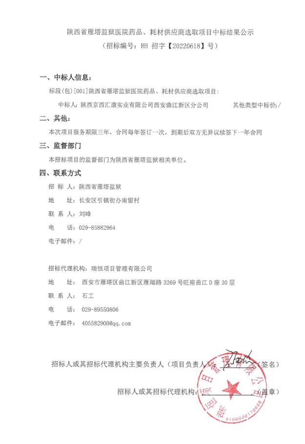 【陕西省雁塔监狱医院】药品、耗材供应商选取中标结果公示