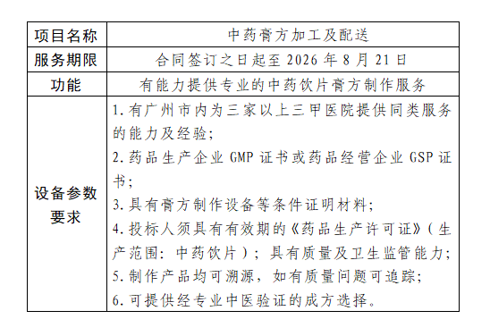 依据我院临床需要,拟采购第三方针对中药饮片的膏方加工及配送服务,现对该服务进行市场调研,欢迎符合资格条件的供应商参与咨询报价。
