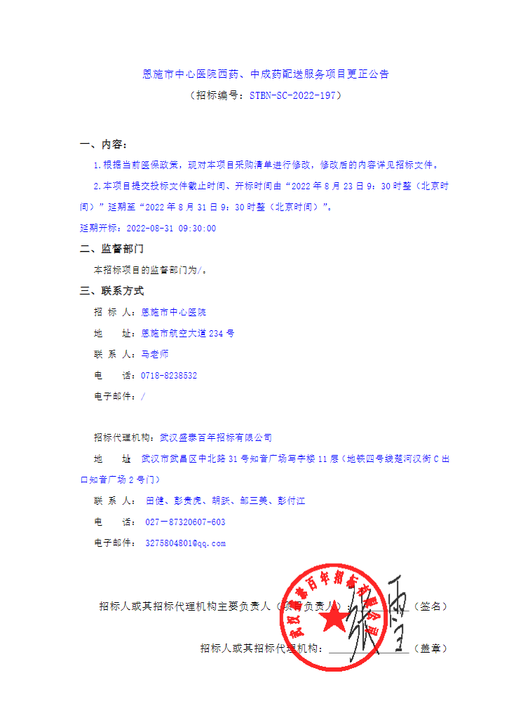 【恩施市中心医院】恩施市中心医院西药、中成药配送服务项目更正公告