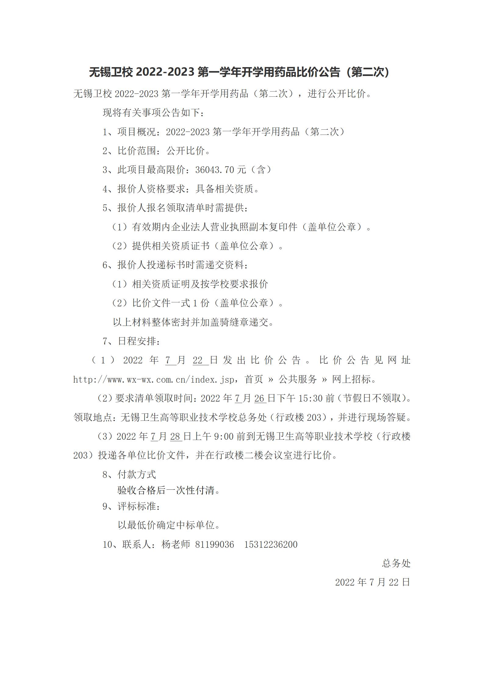 【无锡卫校】无锡卫校2022-2023第一学年开学用药品比价公告(第二次)