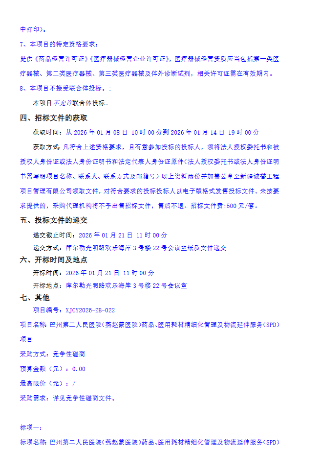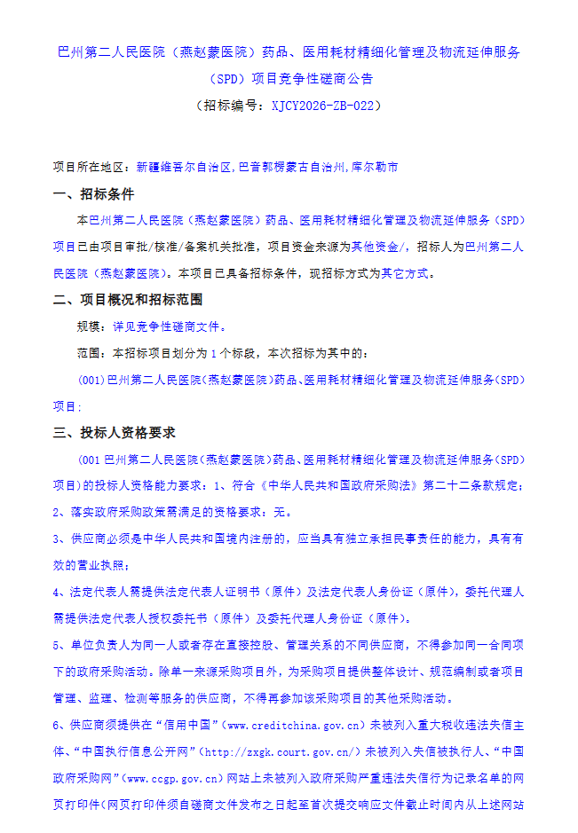 【巴音郭楞蒙古自治州第二人民医院】新疆维吾尔自治区巴州第二人民医院(燕赵蒙医院)药品、医用耗材精细化管理及物流延伸服务(SPD)项目竞争性磋商公告