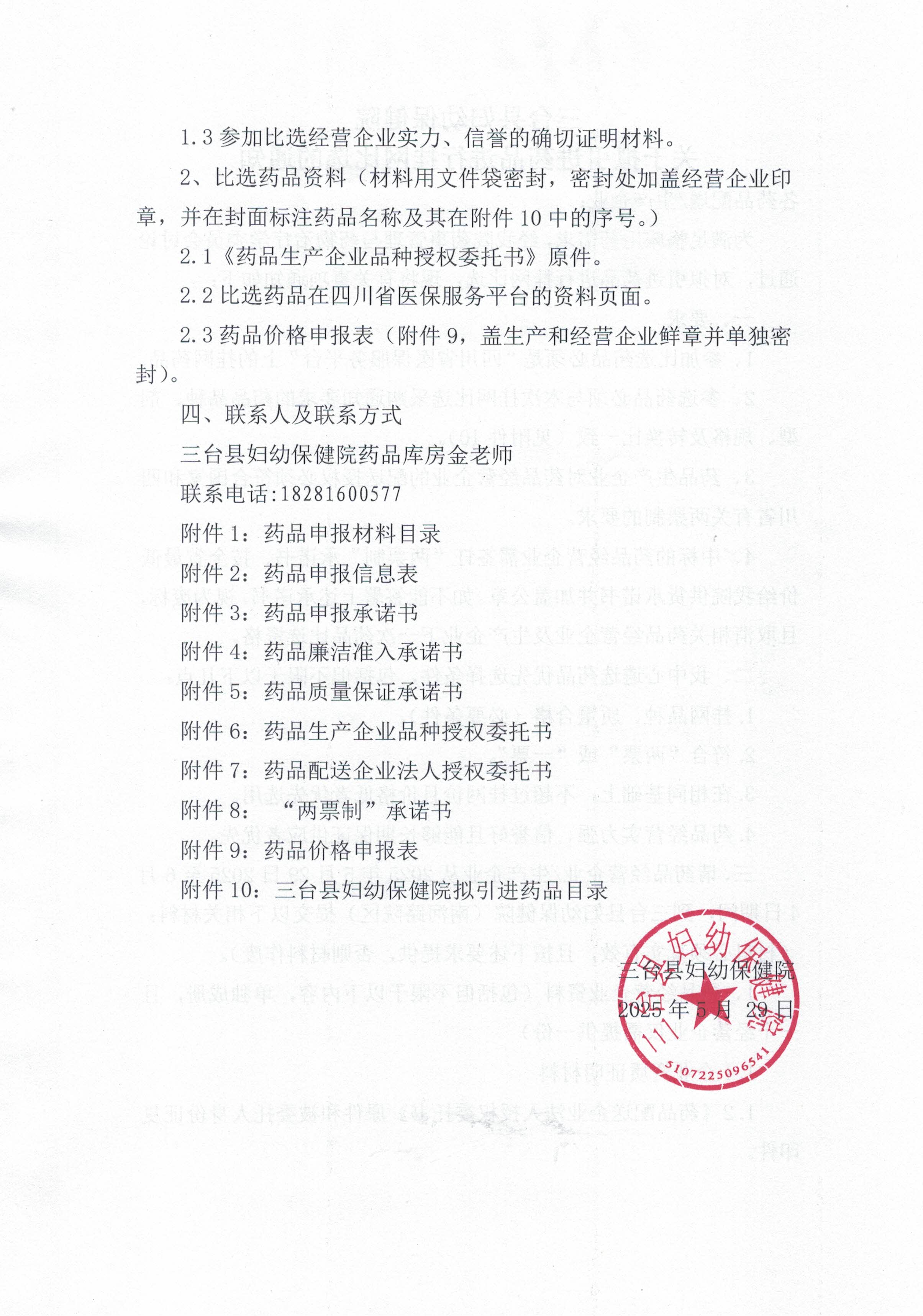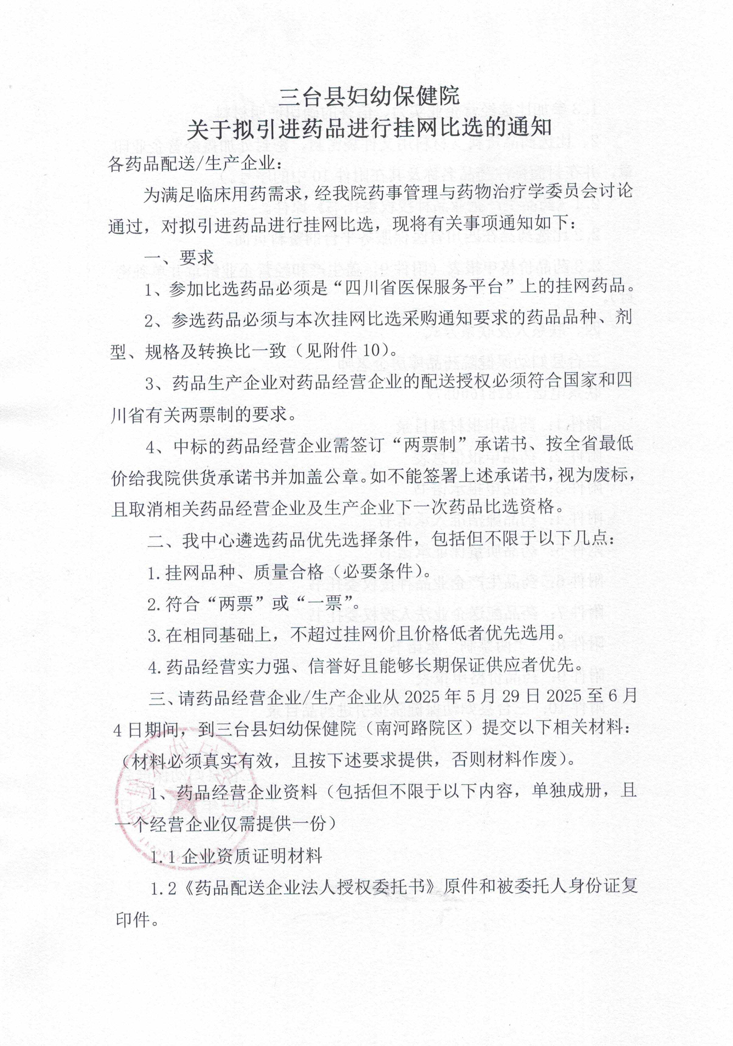 【绵阳市三台县妇幼保健院】四川省绵阳市三台县妇幼保健院关于拟引进药品进行挂网比选的通知(20250529)