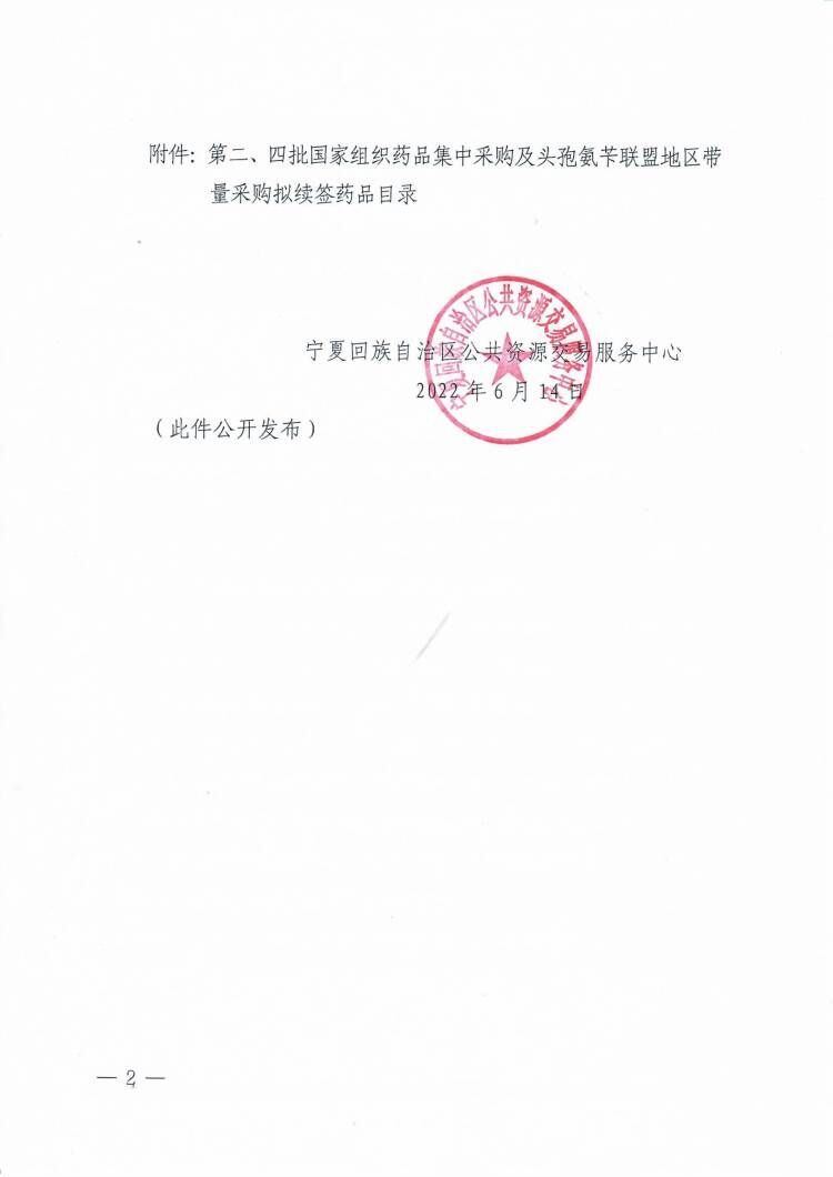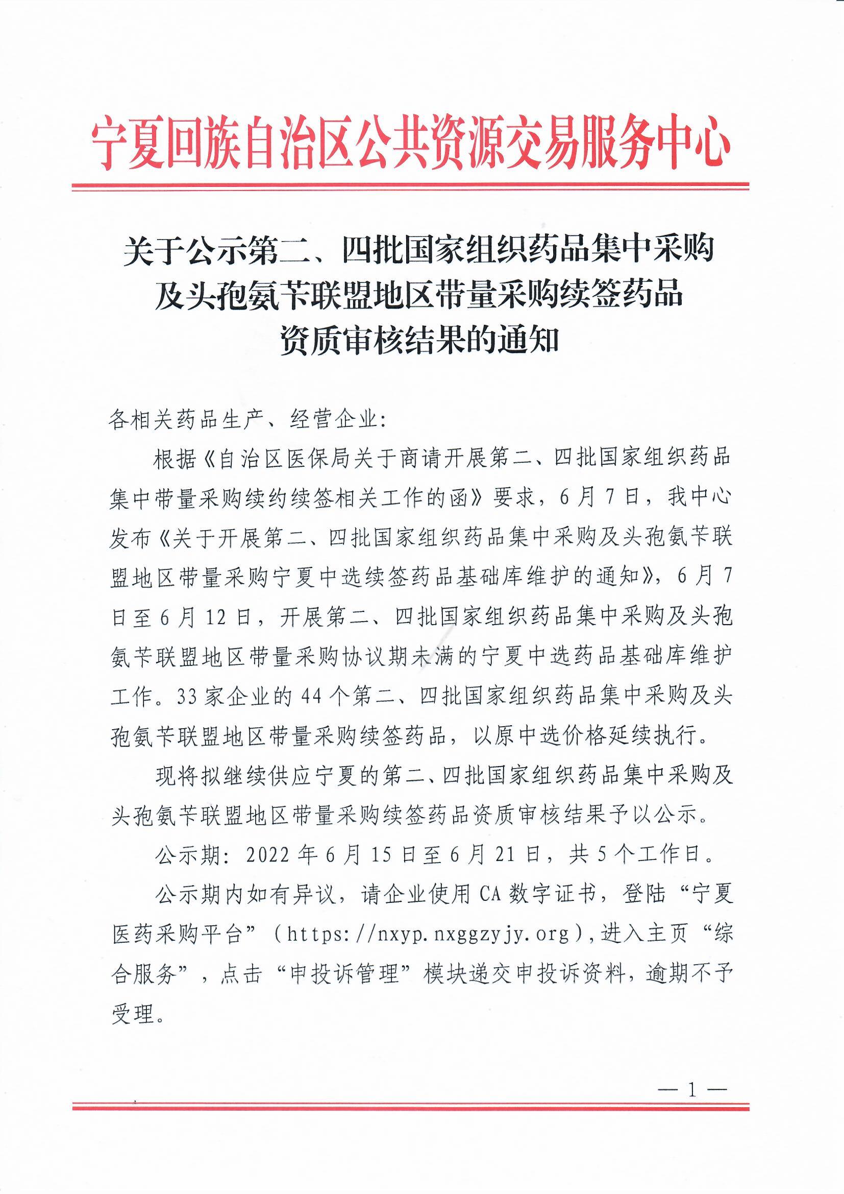 【宁夏】关于公示第二、四批国家组织药品集中采购及头孢氨苄联盟地区带量采购续签药品资质审核结果的通知