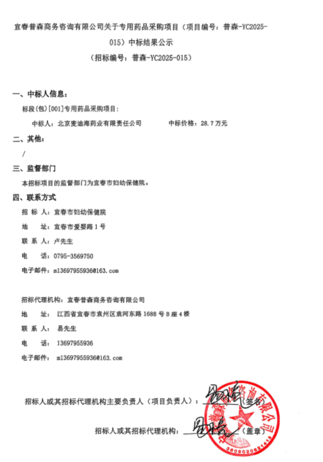 【宜春市妇幼保健院】江西省宜春普森商务咨询有限公司关于专用药品采购项目(项目编号:普森-YC2025-015)中标结果公示