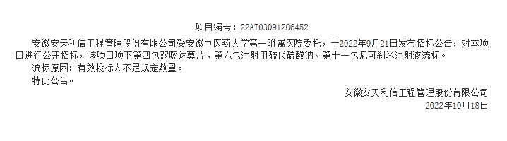 【安徽中医药大学第一附属医院】采购2022年部分药品(第一批)流标公示(20221018)