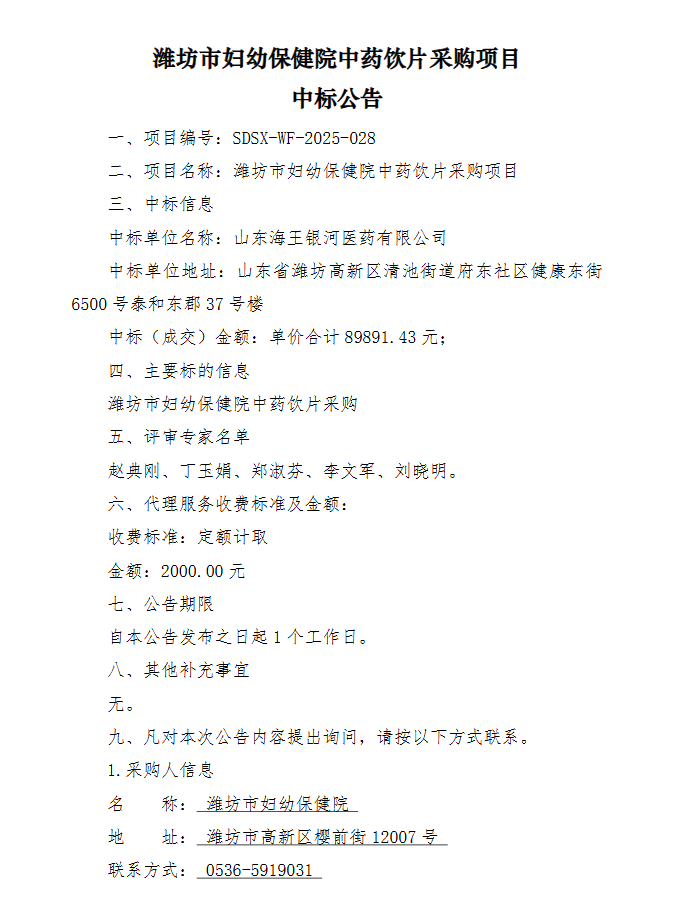 【潍坊市妇幼保健院】山东省潍坊市妇幼保健院中药饮片采购项目中标公告