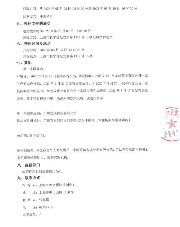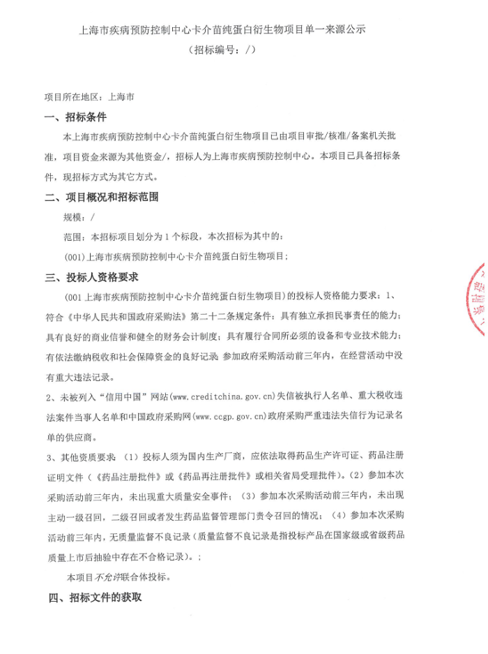 【上海市疾病预防控制中心】上海市疾病预防控制中心卡介苗纯蛋白衍生物项目单一来源公示