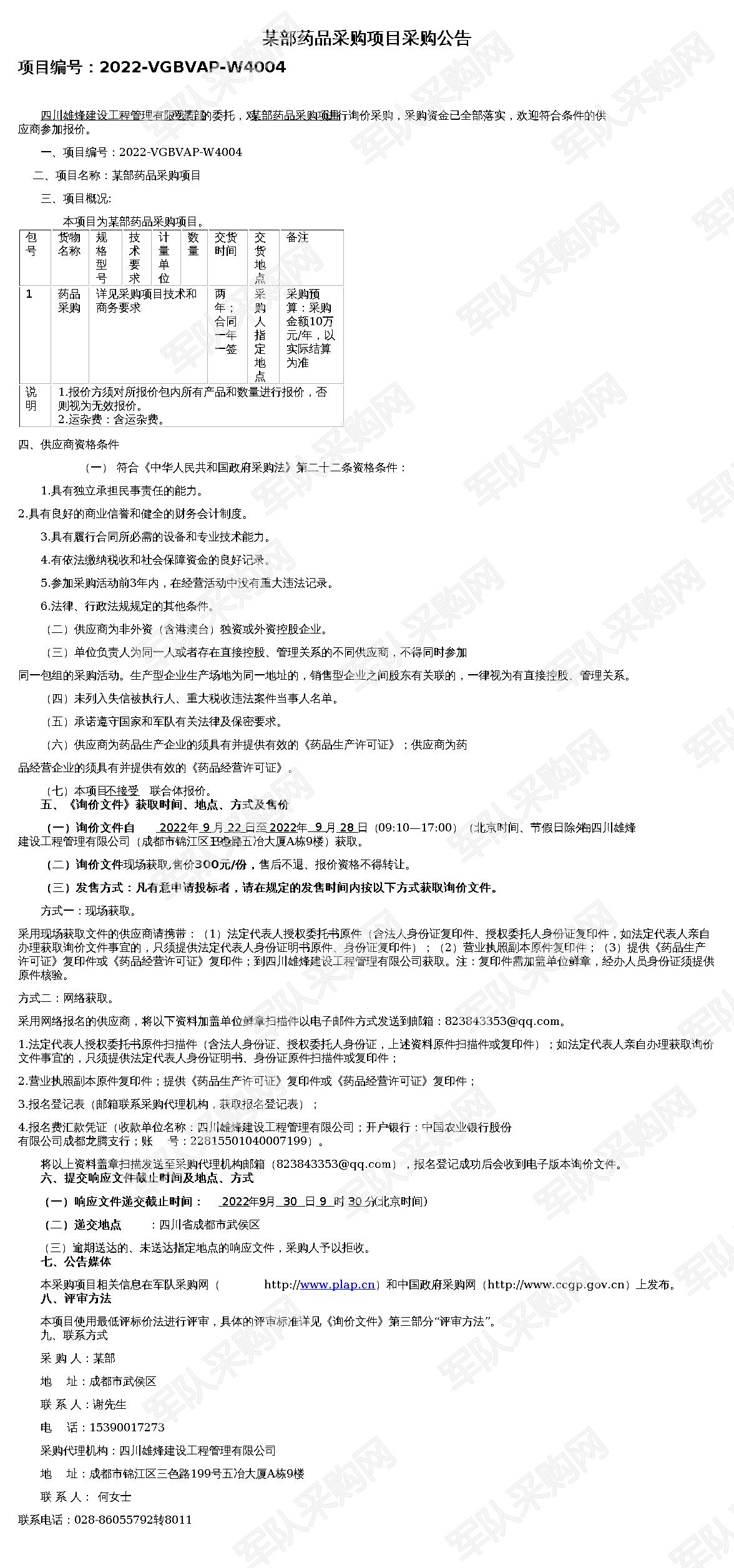 【军队采购网】某部药品采购项目采购公告(2022-VGBVAP-W4004)