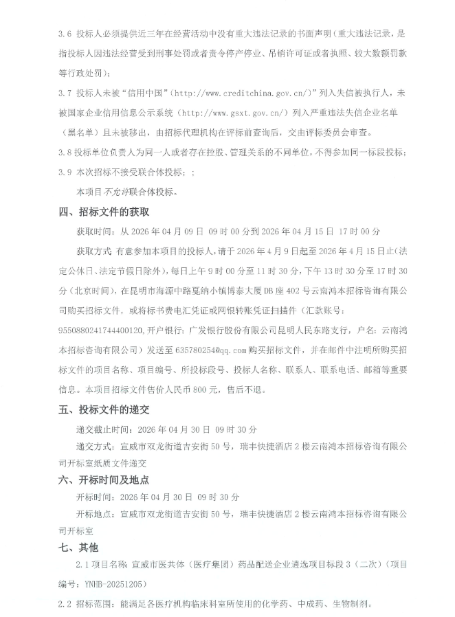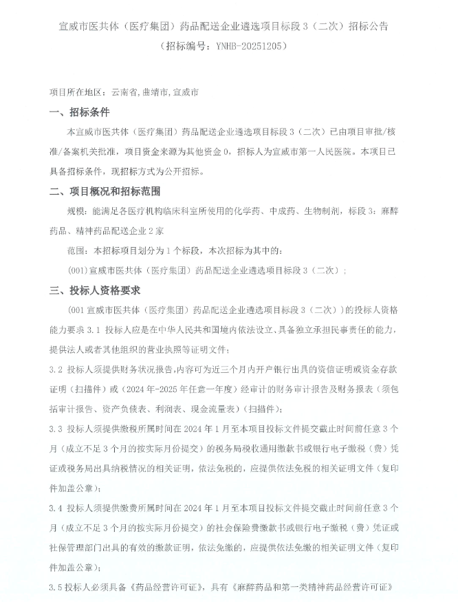 【曲靖市宣威市第一人民医院】云南省宣威市医共体(医疗集团)药品配送企业遴选项目标段3(二次)招标公告