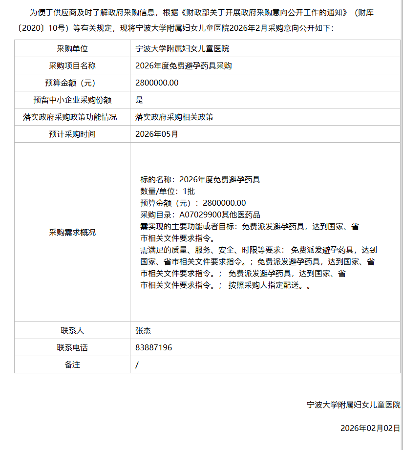 【宁波大学附属妇女儿童医院】浙江省宁波大学附属妇女儿童医院2026年2月政府采购意向