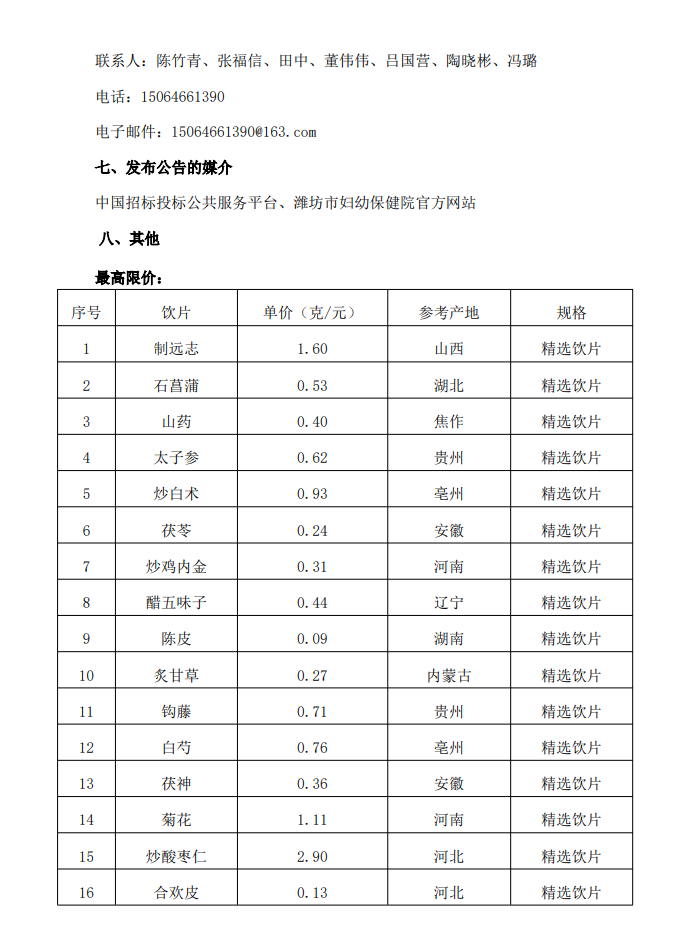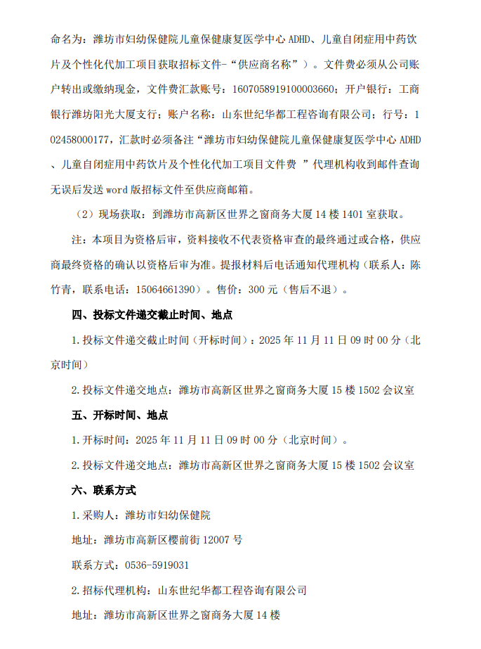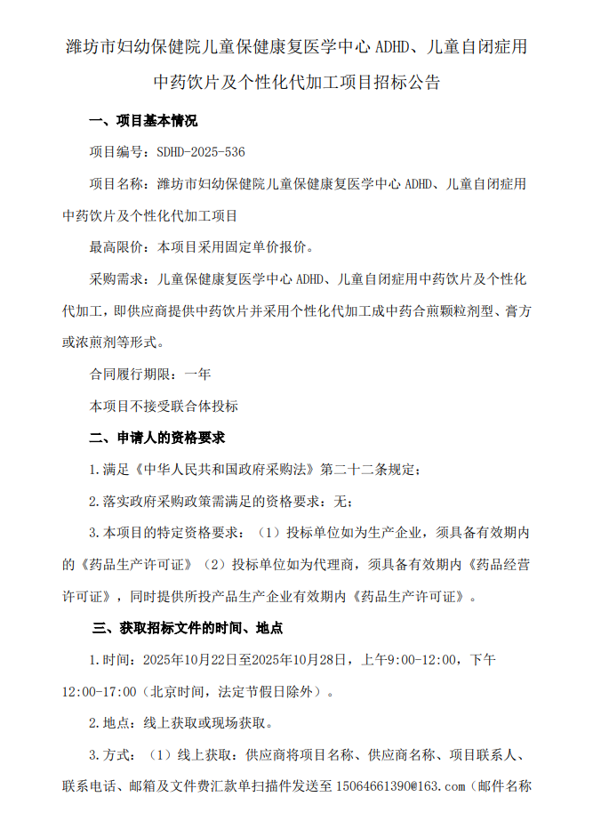 【潍坊市妇幼保健院】山东省潍坊市妇幼保健院儿童保健康复医学中心ADHD、儿童自闭症用中药饮片及个性化代加工项目招标公告