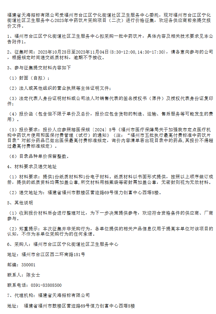 【福州市台江区宁化街道社区卫生服务中心】福建省福州市台江区宁化街道社区卫生服务中心2025年中药饮片采购项目(二次)价格征集公告