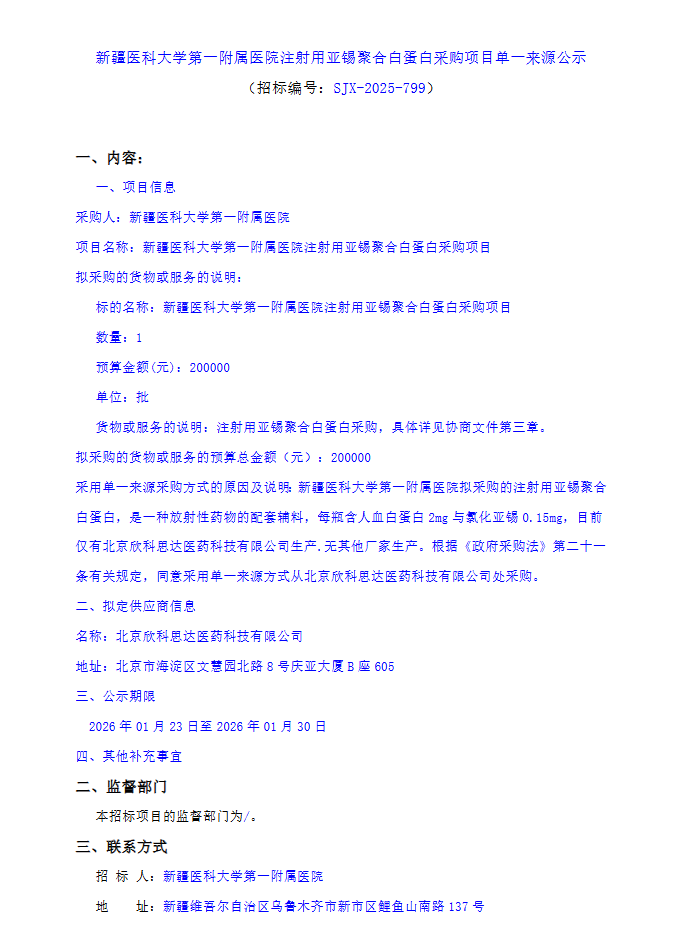 【新疆医科大学第一附属医院】新疆医科大学第一附属医院注射用亚锡聚合白蛋白采购项目单一来源公示