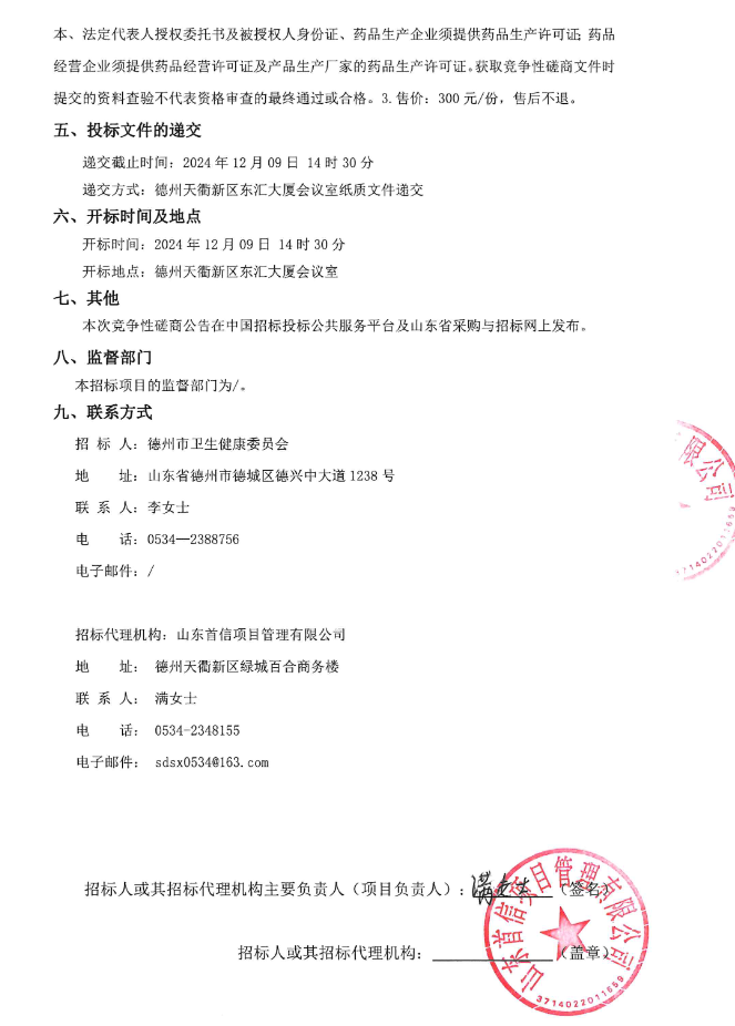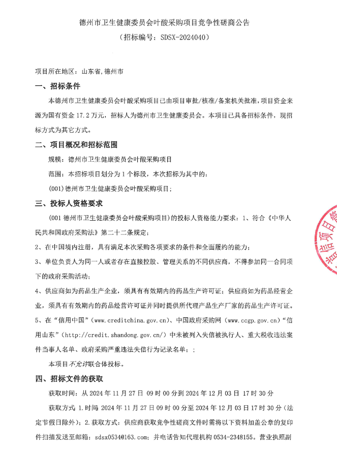 【德州市卫生健康委员会】山东省德州市卫生健康委员会叶酸采购项目竞争性磋商公告