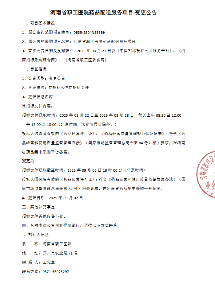 【河南省职工医院】河南省职工医院药品配送服务项目-变更公告