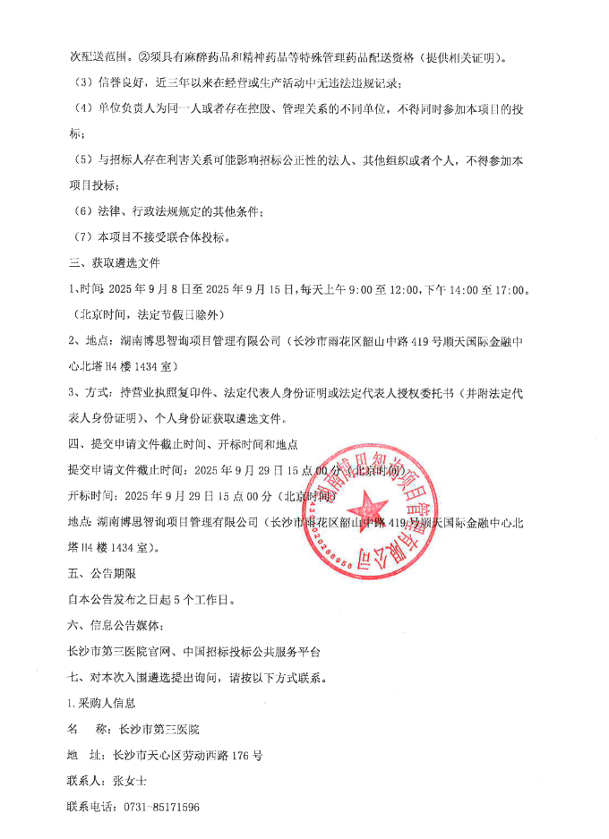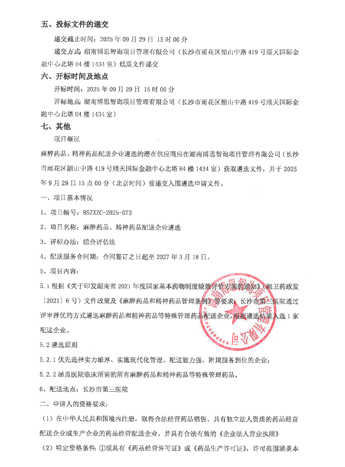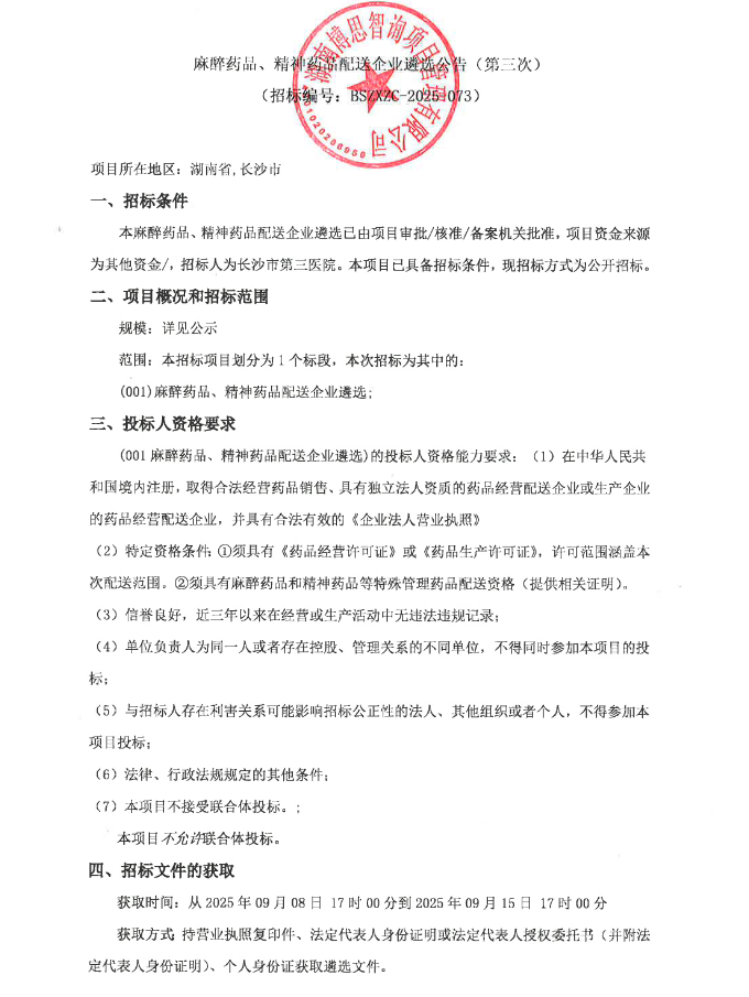 【长沙市第三医院】湖南省长沙市第三医院麻醉药品、精神药品配送企业遴选公告(第三次)