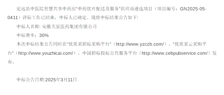 【滁州市定远县中医院】安徽省滁州市定远县中医院智慧共享中药房“中药饮片配送及服务”供应商遴选项目中标公告
