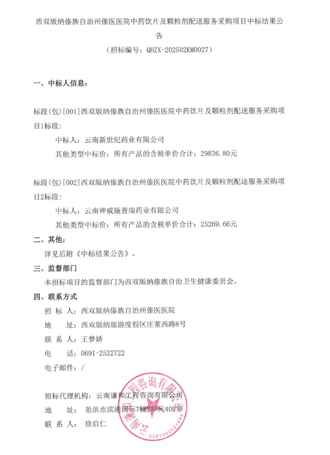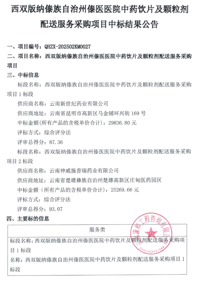 【西双版纳傣族自治州傣医医院】云南省西双版纳傣族自治州傣医医院中药饮片及颗粒剂配送服务采购项目中标结果公告
