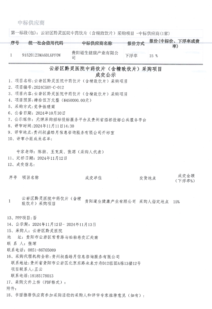 【贵阳市云岩区黔灵医院】贵州省贵阳市云岩区黔灵医院中药饮片(含精致饮片)采购项目成交公示