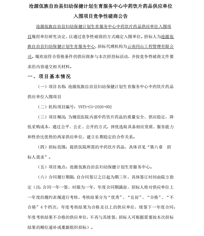 【临沧市沧源佤族自治县妇幼保健计划生育服务中心】云南省临沧市沧源佤族自治县妇幼保健计划生育服务中心中药饮片药品供应单位入围项目
