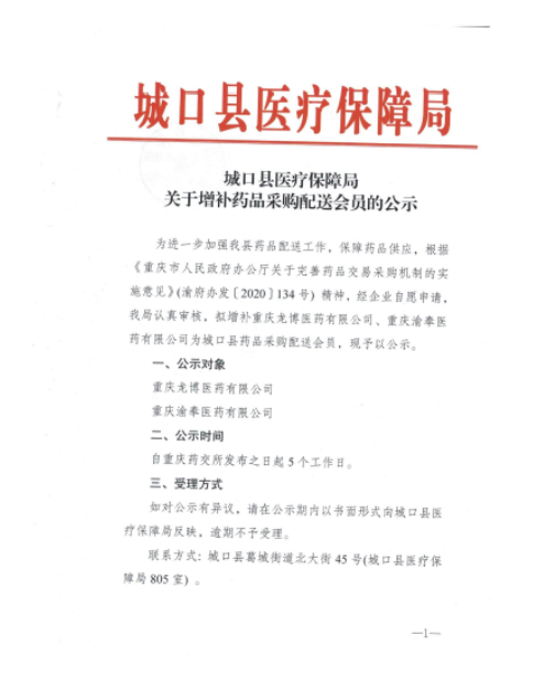 【重庆】重庆市城口县医疗保障局关于增补药品采购配送会员的公示