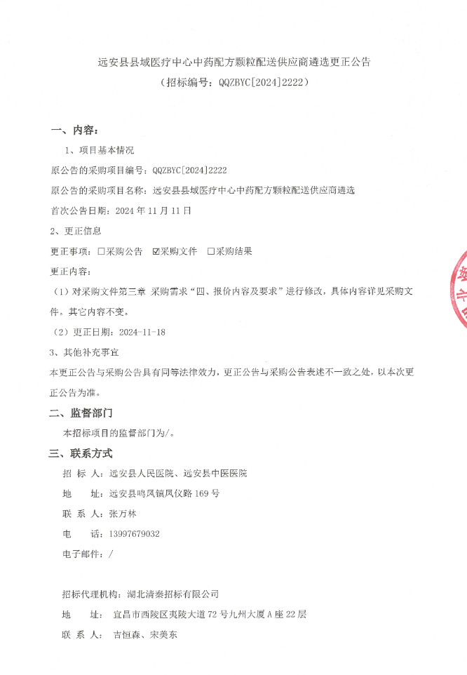 【宜昌市远安县人民医院】湖北省宜昌市远安县县域医疗中心中药配方颗粒配送供应商遴选更正公告